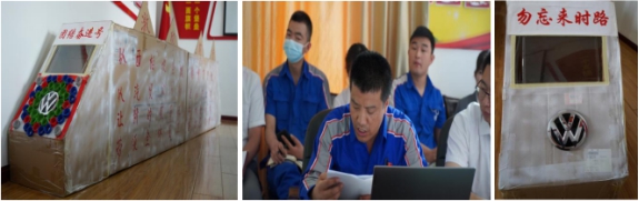 西柏坡精神是部生動的教科書,車間工人黨員袁有德利用平時(shí)裝配件的紙盒子,創(chuàng)意性地制做了一列"團(tuán)結(jié)奮進(jìn)號"火車,邀請黨員一起乘車前行。袁有德說:"團(tuán)結(jié)奮進(jìn)號"列車蘊(yùn)含著學(xué)習(xí)西柏坡精神,強(qiáng)企富家、團(tuán)結(jié)奮進(jìn)的寓意,車頭前面的"大眾"標(biāo)識代表公司經(jīng)營的品牌;八個(gè)綠色的大美孚機(jī)油蓋代表八方來財(cái),所有蓋口都向外代表招攬客戶,減少流失,而且像螺絲釘一樣牢牢釘?。≤囶^車尾標(biāo)有"勿忘來時(shí)路"的字樣,以此提醒廣大黨員干部不忘初心、牢記使命,一定不要忘記來時(shí)的路,回顧過去,展望未來,讓"團(tuán)結(jié)奮進(jìn)"號列車在西柏坡精神的感召下前行。支部要求,在疫情防控和汽車行車嚴(yán)竣的形勢下,我們每一個(gè)物產(chǎn)汽貿(mào)員工都是新時(shí)代的答卷者,讓"團(tuán)結(jié)奮進(jìn)號"奔馳在新時(shí)代的征程上,承載著中國夢、物產(chǎn)夢,承載著物產(chǎn)汽貿(mào)職工群眾對美好生活的向往,風(fēng)馳電掣,勇往直前,奔向未來!