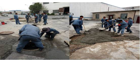 時(shí)至夏日,天氣多變。臨時(shí)土建維修隊(duì)充分發(fā)揮車(chē)間人員中懂得土建施工技能的優(yōu)勢(shì),悉心謀劃,從職工家中借用攪拌機(jī)等施工機(jī)械,加班加點(diǎn)有序進(jìn)行著屋面防水修復(fù)、路面地基處理、排水溝的修復(fù)等維修工作。在公司車(chē)隊(duì)密切配合下,截至6月4日共修復(fù)屋面防水358平方米,路面維修290平方米、路基整修87立方米,排水溝修復(fù)15米,生產(chǎn)廠區(qū)道路破裂,瀝青澆灌等各項(xiàng)工作。
