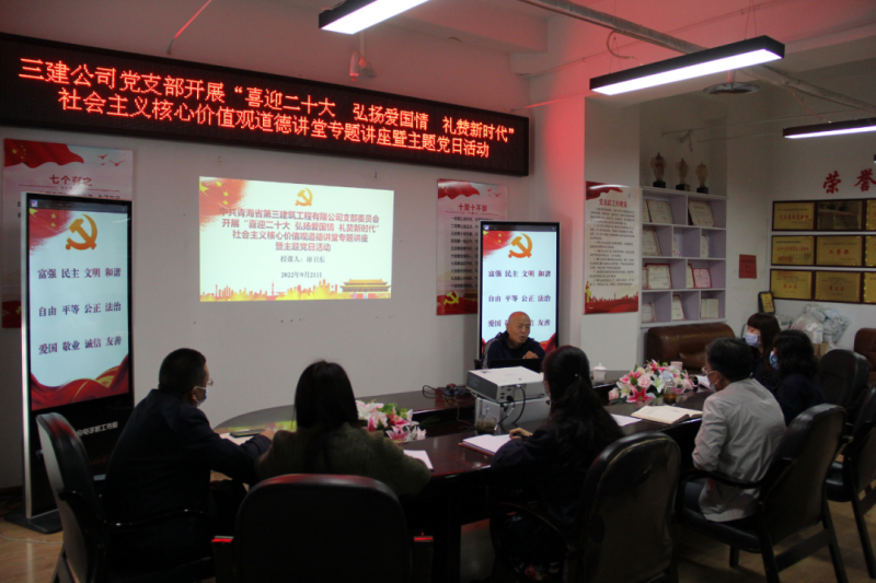 (省三建公司 訊 韓毓、王文杰/文 韓毓/攝 )2022年是黨的二十大召開之年,是落實(shí)省第十四次黨代會(huì)精神開局之年。為持續(xù)鞏固拓展黨史學(xué)習(xí)教育成果,加強(qiáng)精神文明建設(shè),深化民族團(tuán)結(jié)進(jìn)步宣傳教育和感恩教育,講好各族民族守望相助、團(tuán)結(jié)奮進(jìn)的國(guó)企故事,積極培育和踐行社會(huì)主義核心價(jià)值觀,9月21日,公司黨支部開展“喜迎二十大 弘揚(yáng)愛國(guó)情 禮贊新時(shí)代”社會(huì)主義核心價(jià)值觀道德講堂專題講座暨主題黨日活動(dòng)。