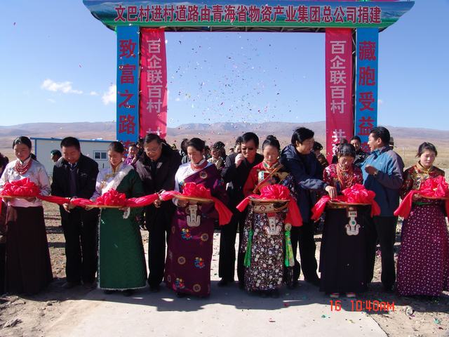 交接儀式上,集團公司總經(jīng)理王玉輝、共和縣人大常委會主任尕瑪才讓為元者村黨員活動室、科普文化室、醫(yī)療衛(wèi)生室揭牌之后,與黨委書記白家林、紀委書記王仁芬、共和縣委常委、組織部長官卻南見等領(lǐng)導(dǎo)為共和縣黑馬河鄉(xiāng)文巴村進村道路通車剪彩。集團公司黨委書記白家林代表省物產(chǎn)集團向共和縣江西溝鄉(xiāng)提前捐送元者村游牧民定居點工程配套資金100,000元。集團公司紀委書記王仁芬、共和縣委常委、組織部長官卻南見、江西溝鄉(xiāng)元者村村長、文巴村村長分別代表捐建方、受捐方致辭發(fā)言。至此,青海物產(chǎn)集團在"百企聯(lián)百村"活動中擬投入的1,455,500元,已到位1,255,500元。剩余的200,000元游牧民定居點工程建設(shè)項目捐款將根據(jù)工程進度分期轉(zhuǎn)付。