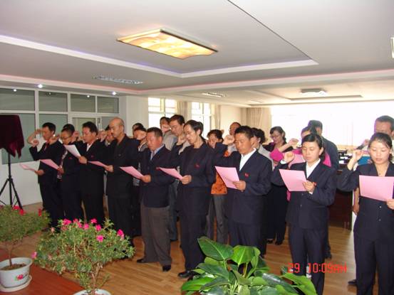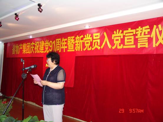 我宣誓:"我志愿加入中國共產(chǎn)黨,擁護黨的綱領(lǐng),遵守黨的章程,履行黨員義務(wù),執(zhí)行黨的決定,嚴(yán)守黨的紀(jì)律,保守黨的秘密,對黨忠誠,積極工作,為共產(chǎn)主義奮斗終身,隨時準(zhǔn)備為黨和人民犧牲一切,永不叛黨"。6月29日上午10∶00時,17名新加入黨組織的中國共產(chǎn)黨預(yù)備黨員、所屬各黨組織書記、老黨員代表等30余人的莊嚴(yán)宣誓,標(biāo)志著青海物產(chǎn)系統(tǒng)慶祝建黨91周年系列活動正式展開。